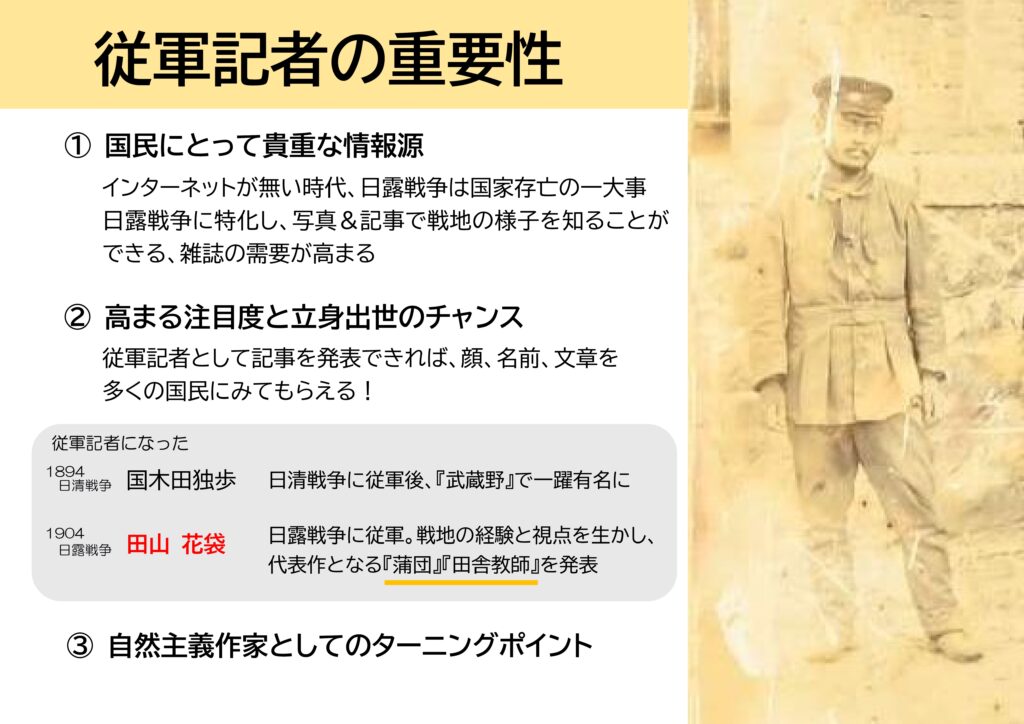 田山花袋が活躍した明治時代は、世界、日本国内ともに情勢が大きく動いた時代でした。その最たるものが国家間での近代戦争であり、日本が世界へ向けて進出しようと模索していた時代でもあります。花袋が大きく関わったのは、明治37 年(1904)に起こった日露戦争です。私設写真班の記者として従軍した花袋は、戦場をつぶさに観察し、戦況報道用の記事、そして家族、友人