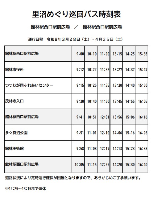 巡航経路=館林駅(西口)〜館林市役所〜つつじが岡ふれあいセンター(城沼)〜茂林寺(茂林寺沼)〜館林駅〜館林美術館〜多々良沼公園(多々良沼)〜館林駅