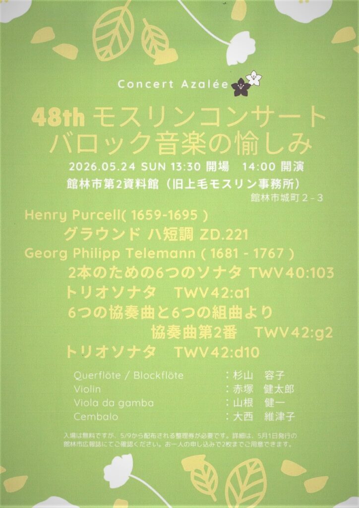 コンセール・アザレ主催「第48回モスリンコンサート 〜バロック音楽の愉しみ〜」